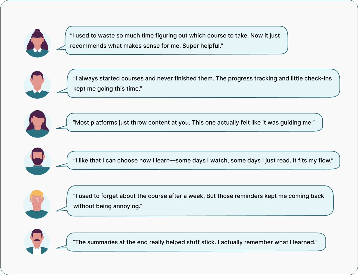Personalized suggestions brought clarity. Interactive checkpoints turned passive watching into real progress. And live tracking gave them a sense of direction. Engagement went up, drop-off went down, and learning finally felt doable.