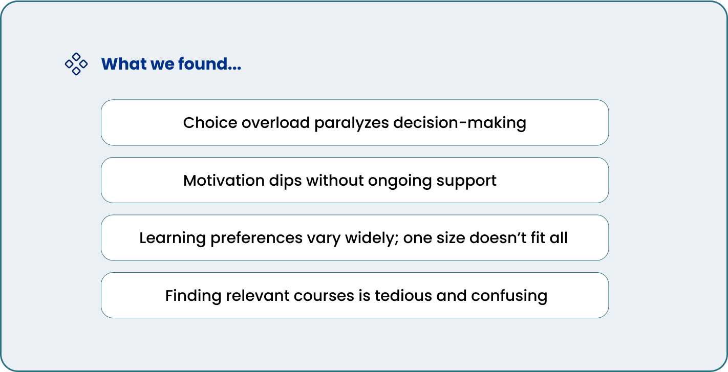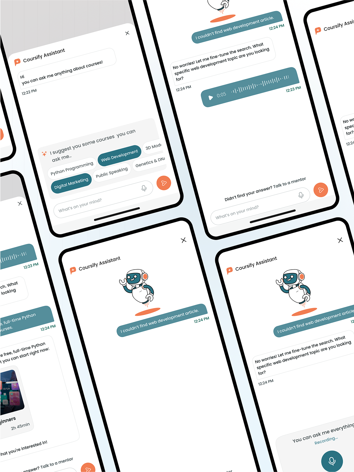 Coursify began as a mission to make learning clear, personalized, and motivating. We dug into how real people learn today, what frustrates them, what keeps them going and shaped the vision around those insights.