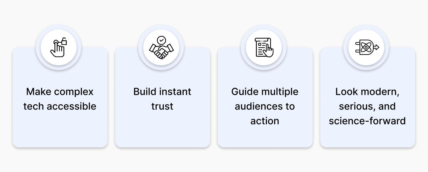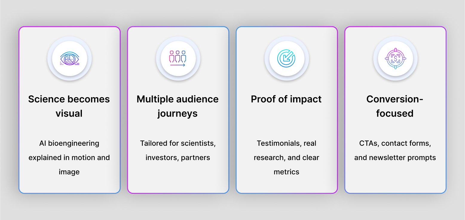 Now, each audience gets a clear path. Scientists see the tech, investors see the impact, partners see the potential. Everything feels purposeful, from the visuals to the calls to action. No guesswork, no clutter! just clarity.